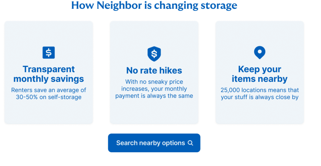 Most storage sites only show you a fraction of what’s available. Neighbor is different. We’re the only marketplace with every kind of storage in one search, from big-name self storage facilities to neighborhood garages, driveways, RV pads, and traditional storage units at a facility.