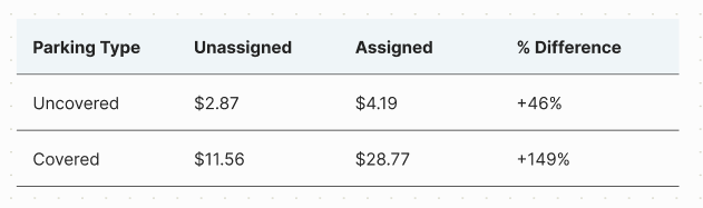 When setting your parking rates, be sure to account for whether your spaces are assigned vs. unassigned. In a 2024 study conducted by Neighbor.com, the data showed that assigned parking is typically charged at higher rates, regardless of whether it’s covered or uncovered parking (based on the raw averages – see below).
