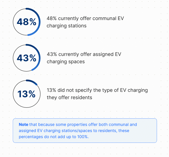 Looking at the 42% of properties that offer EV charging, some properties only offered one type of EV charging (communal charging stations OR assigned EV parking spaces), while others offered both communal and assigned spaces.