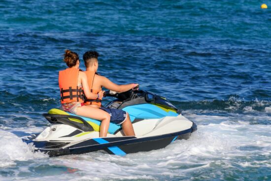 When jet skiing, you’ll need a life jacket, a safety lanyard, sunscreen, and a boating license.