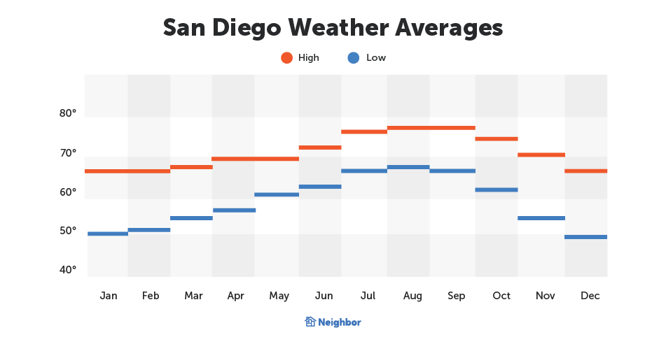 San Diego rarely gets colder than 50 degrees at night or warmer than 80 degrees during the day.