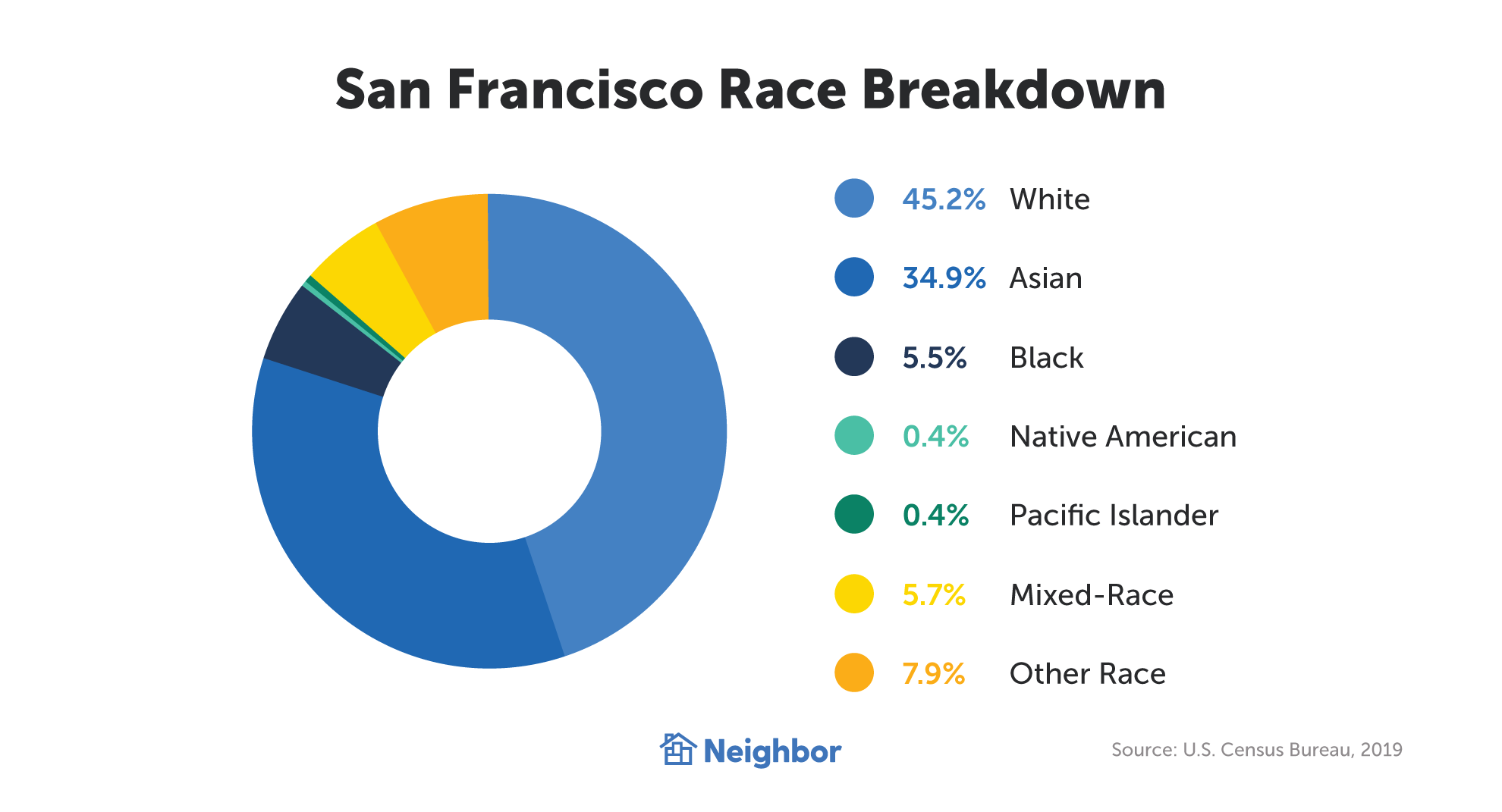 San Francisco (also known by locals as the 7 by 7, the Golden City, or the Bay — but never San Fran) is the 17th largest city in the U.S., with a population of 874,961 as of 2019. It’s the second most population-dense city in the nation, containing more than 15,000 people per square mile.