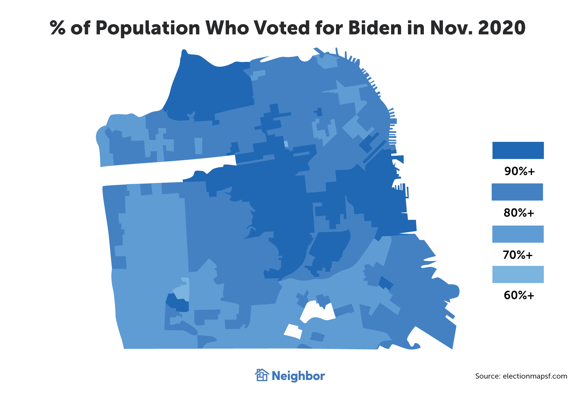 Election Map SF, a project by local designer Chris Arvin, shows in greater detail how staunchly blue the city is. While the number of votes for Biden in 2020 varies by neighborhood, it ranges from 76% of the vote share in some of the city’s southern and coastal neighborhoods, up to 94% in young, progressive neighborhoods like Haight-Ashbury, the Castro, the Mission, and Noe Valley.