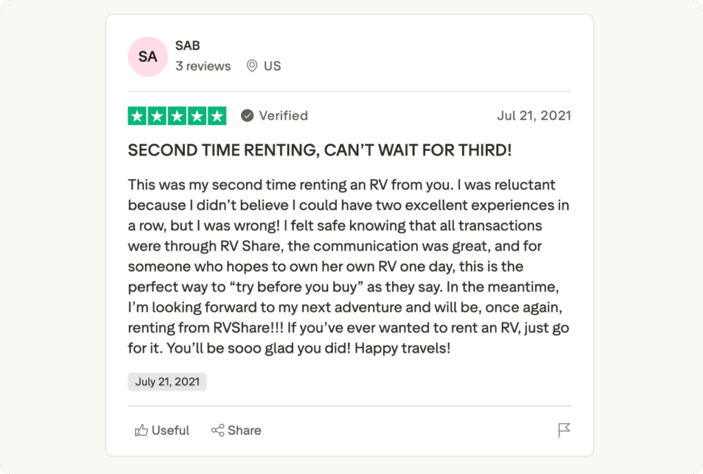 This was my second time renting an RV from you. I was reluctant because I didn’t believe I could have two excellent experiences in a row, but I was wrong! I felt safe knowing that all transactions were through RV Share, the communication was great, and for someone who hopes to own her own RV one day, this is the perfect way to “try before you buy” as they say. In the meantime, I’m looking forward to my next adventure and will be, once again, renting from RVShare!!! If you’ve ever wanted to rent an RV, just go for it. You’ll be sooo glad you did! Happy travels!