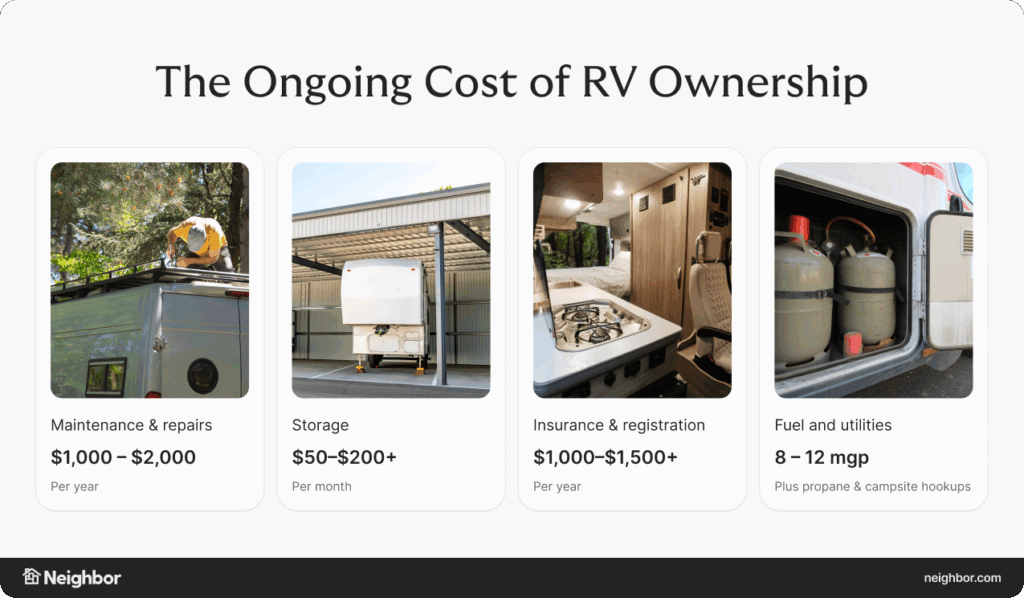 - Storage: Many neighborhoods don’t allow RV parking at home, so you may need off-site storage at $50–$200+ per month. If you’re looking for affordable options, Neighbor.com can help you find nearby spots that fit the budget.