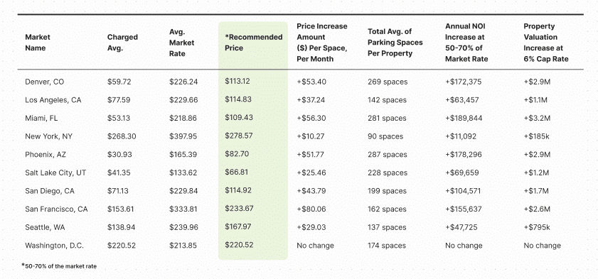 If you already offer on-site parking to residents, you’ll want to optimize your resident parking prices. In Neighbor.com’s 2025 Multifamily Parking Report, the data shows that multifamily owners across the U.S. can increase annual NOI by an average of ~$96k by optimizing their parking prices according to the market rate (*rates set by local parking operators in their area).